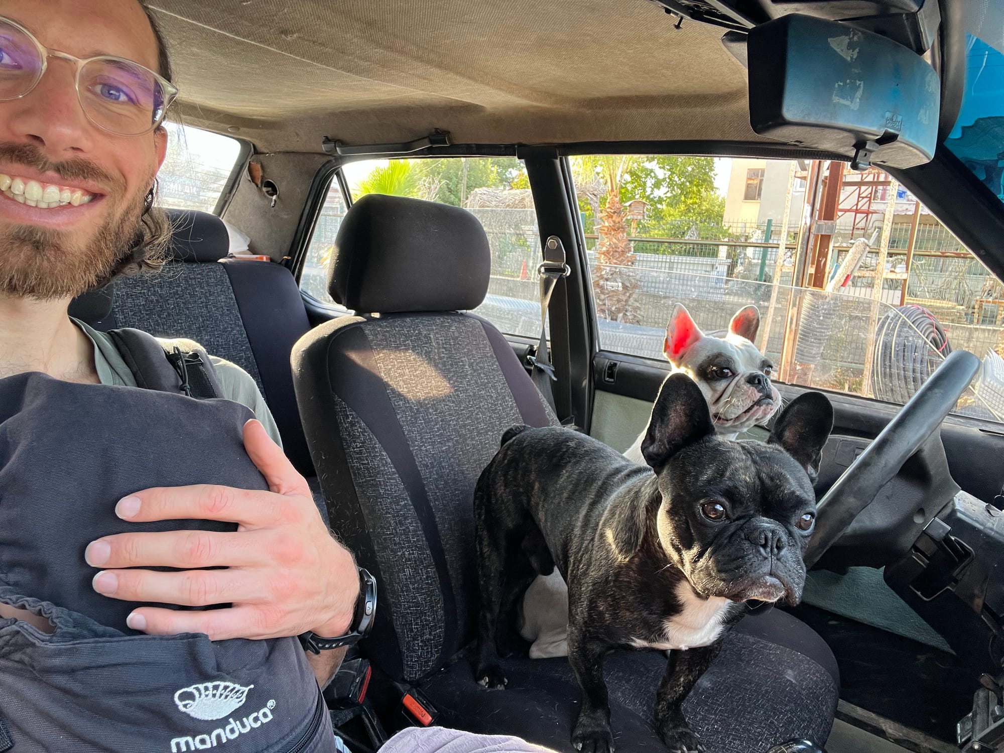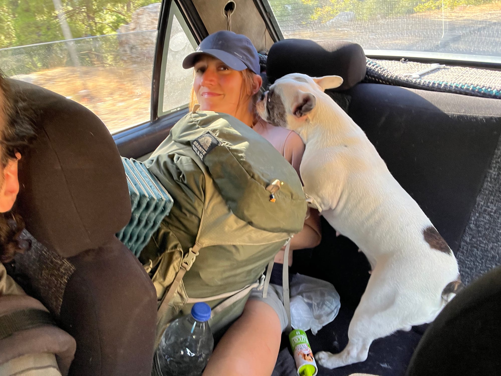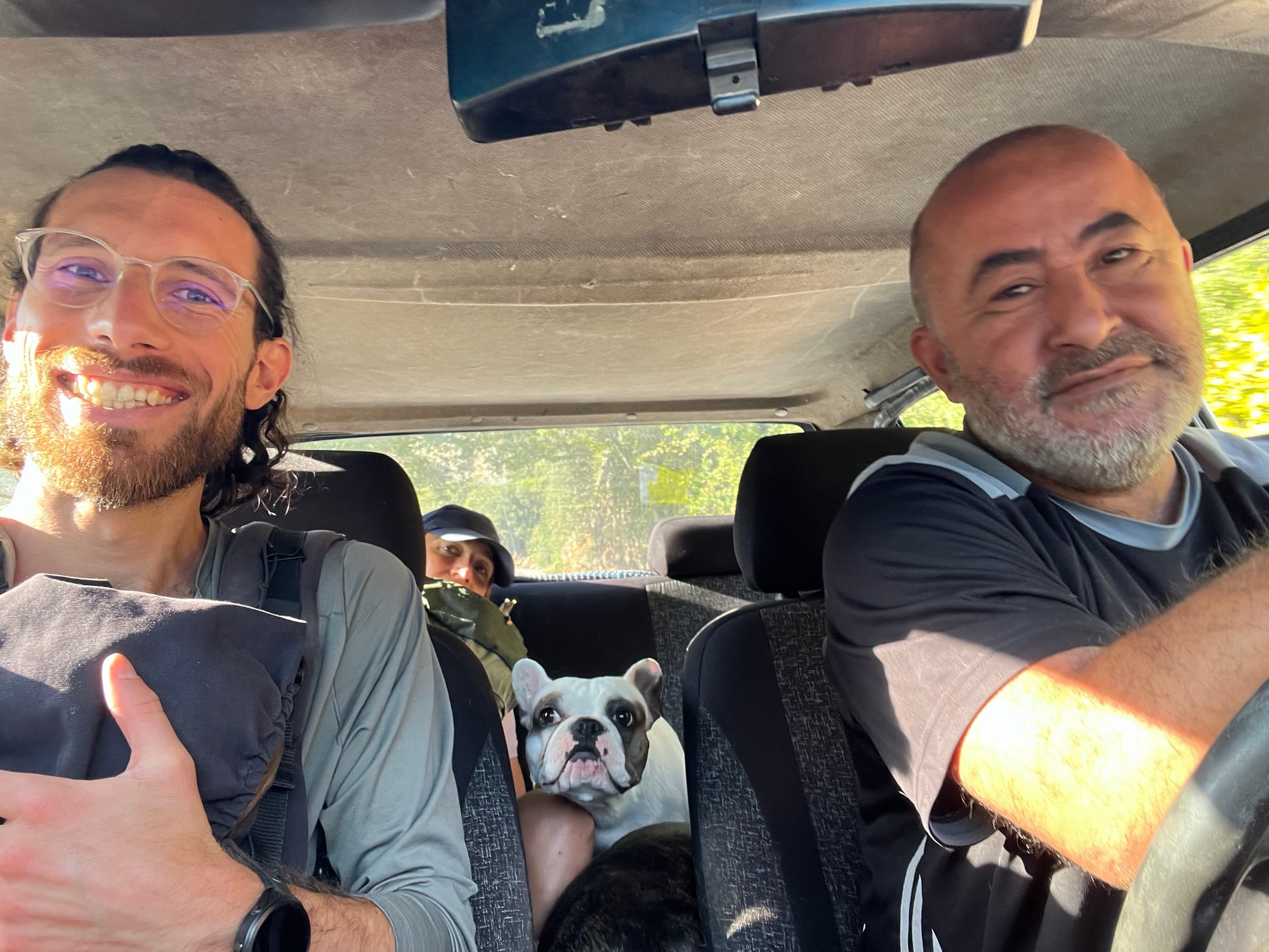 Kurz nachdem wir unsere Hand zum Trampen gehoben hatten, blieb ein Wagen stehen. Wir sahen einen Hund und stiegen nach kurzem Zögern ein – Ivo mit Cleo vorne, um sie vor dem Hund zu schützen, und Marie hinten. Es stellte sich heraus, dass zwei Hunde im Auto waren, die mal vorne, mal hinten sassen – und manchmal direkt auf Marie. Sie leckten sie ab, während sie eine noch unbenutzte Fusselrolle unter sich hervorzog. Die Hunde hiessen Bam Bam und Bebiş – zwei freundliche Bulldoggen.