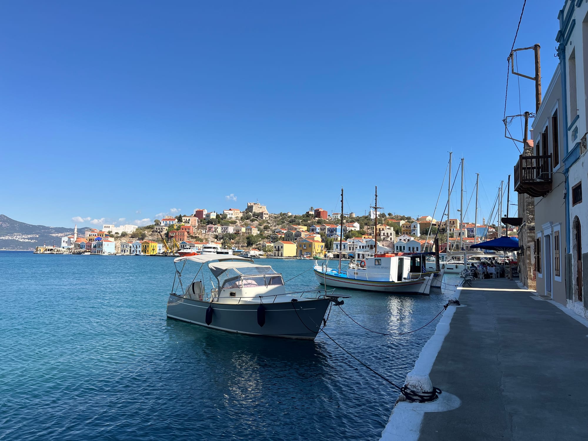 Am nächsten Tag nahmen wir die kurze Fähre (7 Minuten) nach Kastellorizo, einer winzigen griechischen Insel nur zwei Kilometer vom türkischen Festland entfernt – mit gerade einmal 550 Einwohnern. Nach einem Tag kannten wir gefühlt ein Drittel von ihnen.