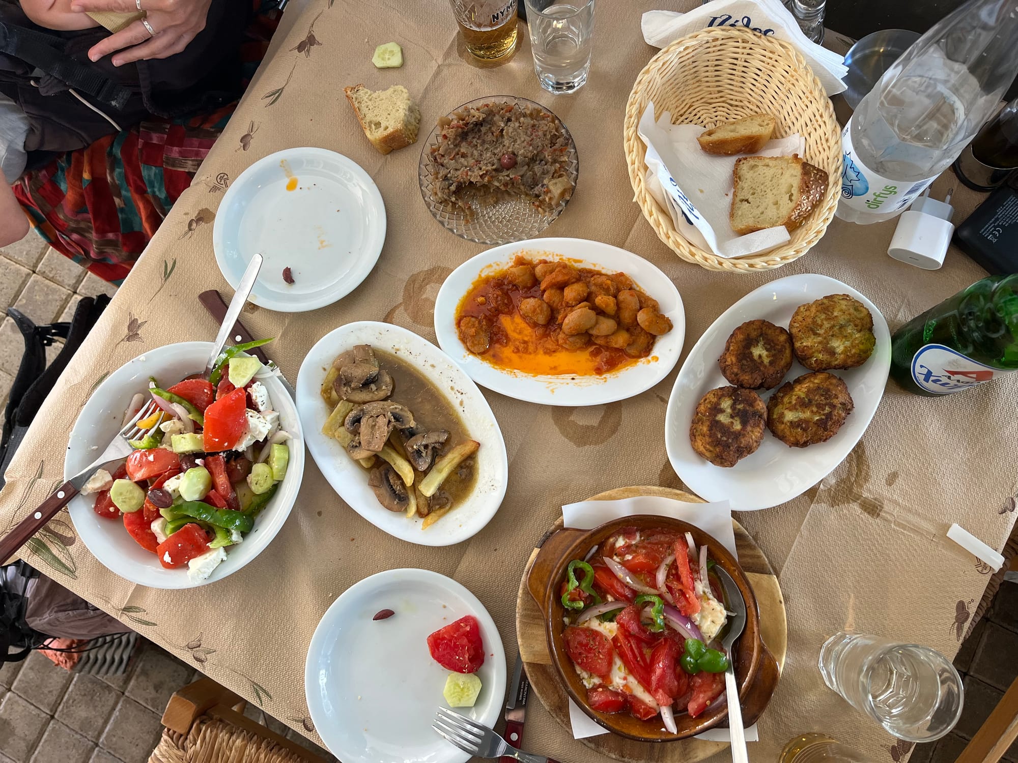 Unsere letzte Mahlzeit in Griechenland war spektakulär – und darf hier nicht unerwähnt bleiben. Ein würdiger Abschluss dieser Teilstrecke: Wir kosteten uns durch eine griechische Speisekarte, die es nur auf Griechisch gab, mithilfe eines freundlichen Kellners. Als wir schon längst satt waren, brachte er uns noch zwei weitere Teller mit Köstlichkeiten, die „vom Haus“ offeriert wurden. Danach rollten wir – im wahrsten Sinne – auf die Fähre.